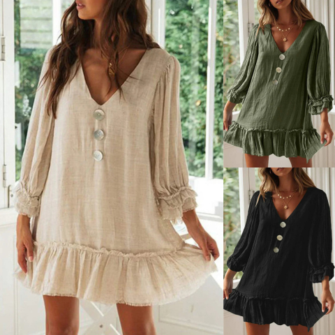 Confeccionado con un tejido ligero de alta calidad, este vestido garantiza comodidad y transpirabilidad durante todo el día. El escote en V profundo estiliza tu figura, mientras que el dobladillo con volantes añade un toque de elegancia divertida. Con su estilo versátil y ajuste favorecedor, se convierte en un básico imprescindible de tu armario.