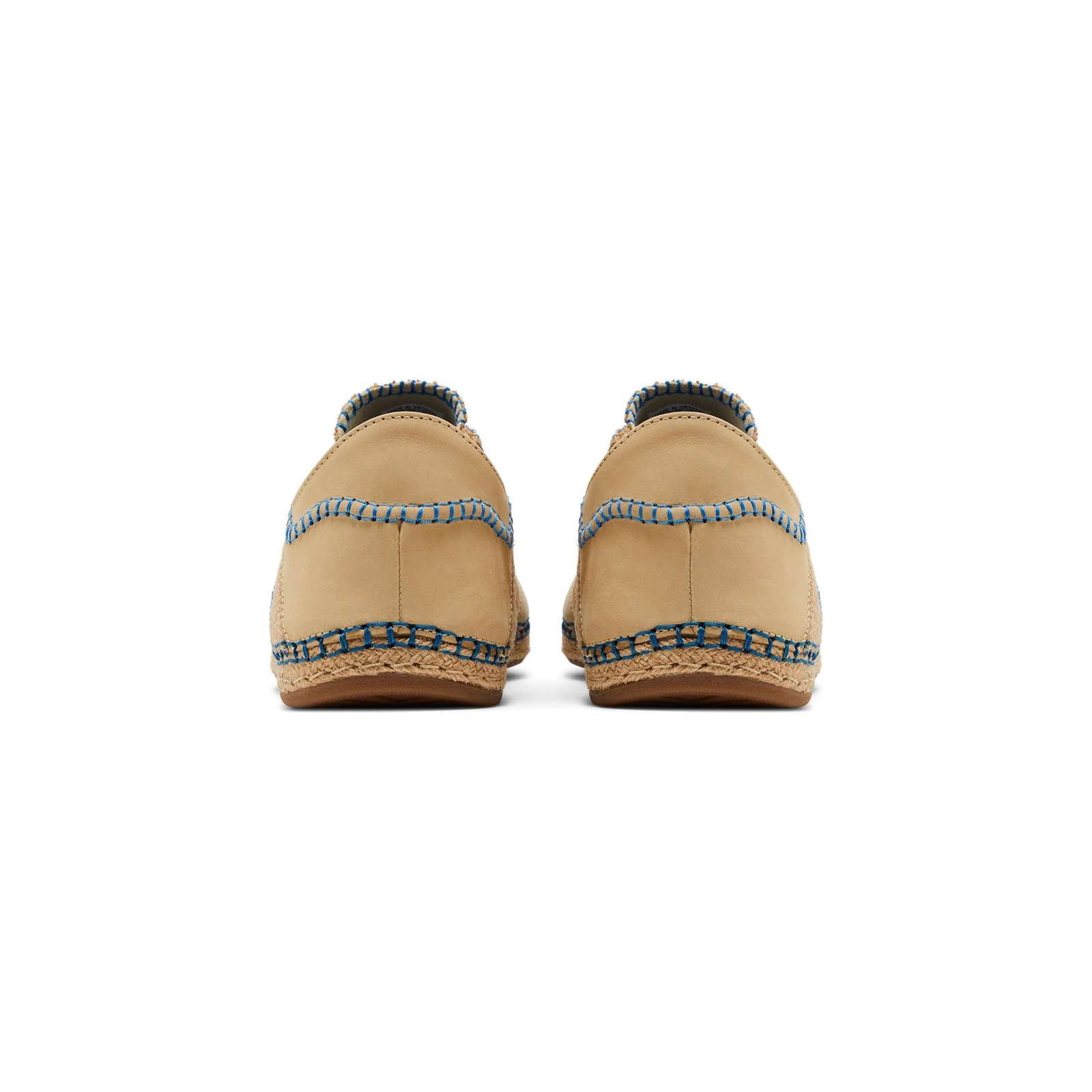 Este modelo destaca por su base en lino color caqui, que se complementa con suaves paneles de piel y detalles bordados en azul claro. Las tres bandas laterales presentan un patrón artesanal tejido a mano que da textura y profundidad, mientras la suela de yute con costuras visibles resalta su aspecto natural y artesanal.
