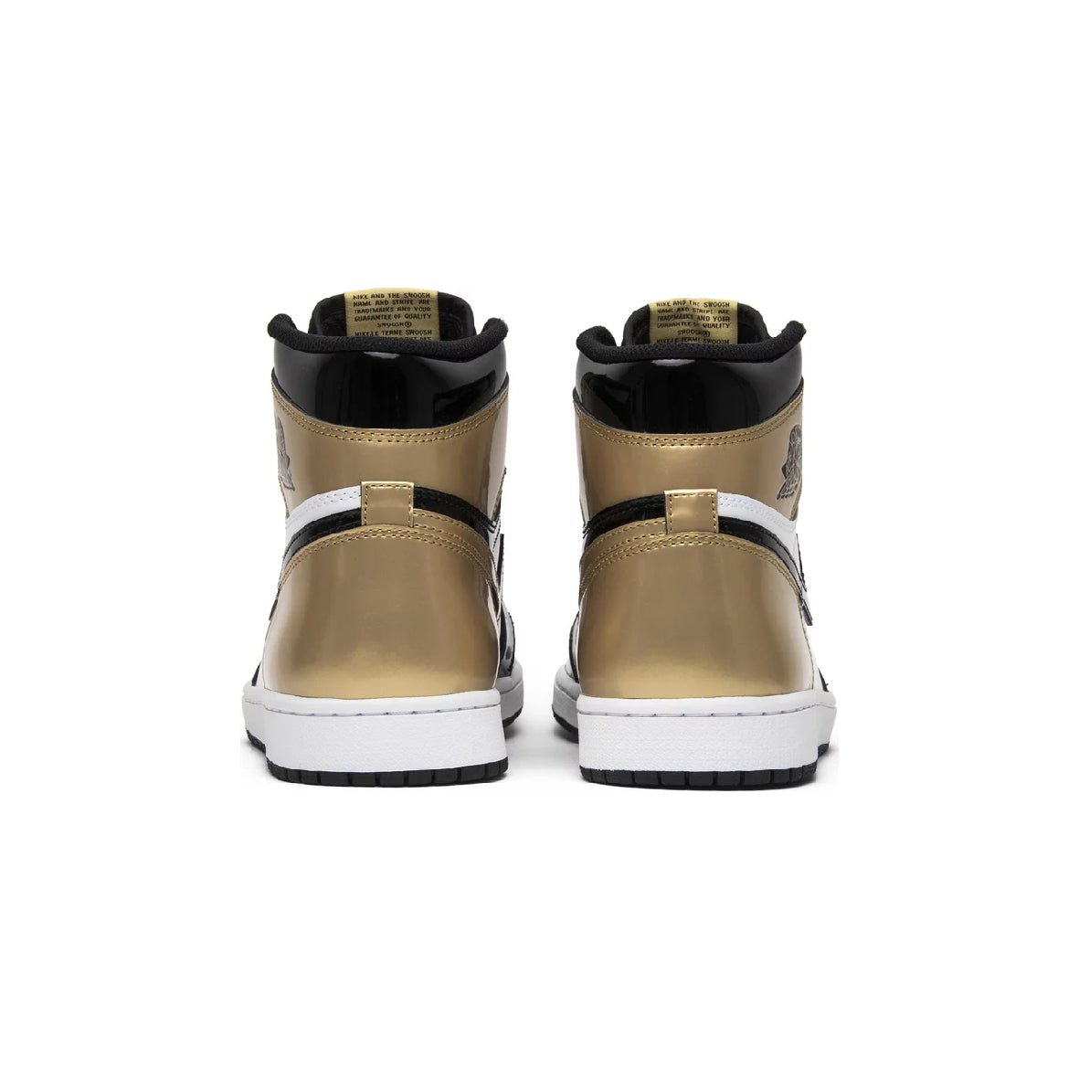 Estas Jordan 1 High lucen un upper en charol blanco y negro con superposiciones metálicas doradas, principalmente en la puntera y el talón. El logo Wings en el tobillo y el Swoosh negro preservan la esencia clásica del modelo, mientras que los materiales brillantes suman un aire lujoso y moderno.