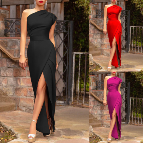 Confeccionado con un tejido elástico de alta calidad, este vestido se adapta a tu figura mientras te mantiene cómoda y fresca. El diseño asimétrico de un solo hombro aporta un toque moderno, y el largo fluido le da un aire de elegancia de alfombra roja. Un imprescindible para cualquier mujer que ama causar impacto.