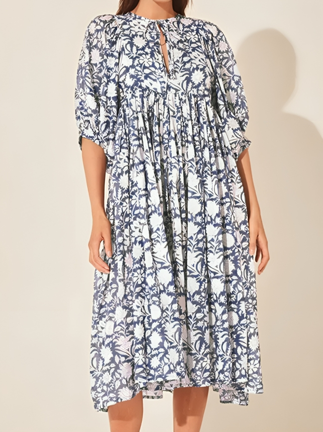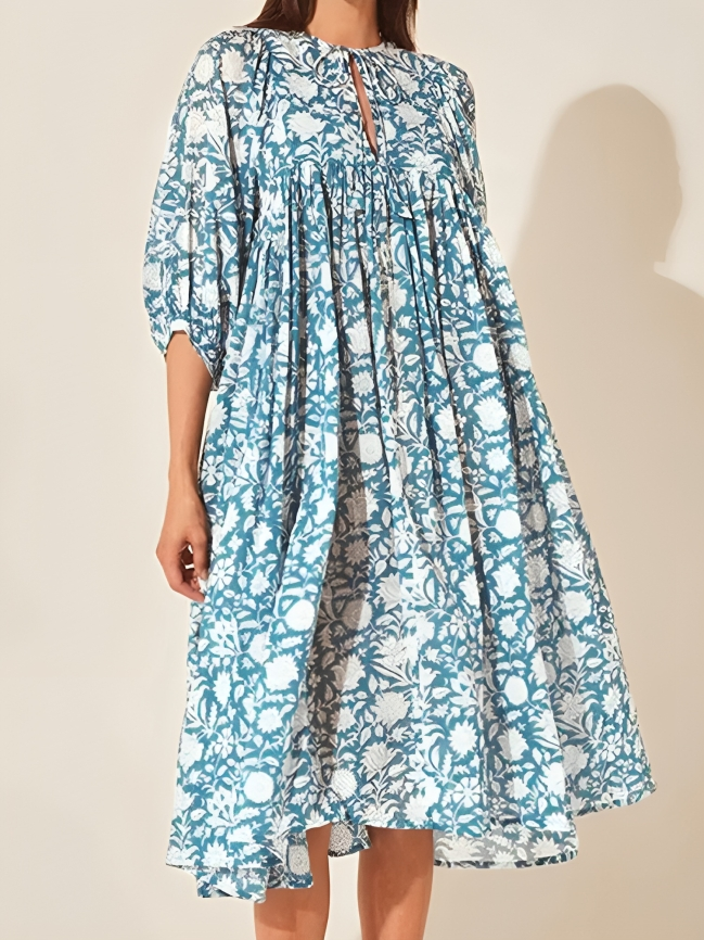 Hecho de tejido ligero y transpirable, este vestido está diseñado para comodidad y estilo en igual medida. Las mangas acampanadas ofrecen un toque juguetón y femenino, mientras que el ajuste relajado asegura libertad de movimiento. Perfecto para cualquier ocasión, este vestido combina suavidad, estilo y versatilidad en una sola prenda perfecta.