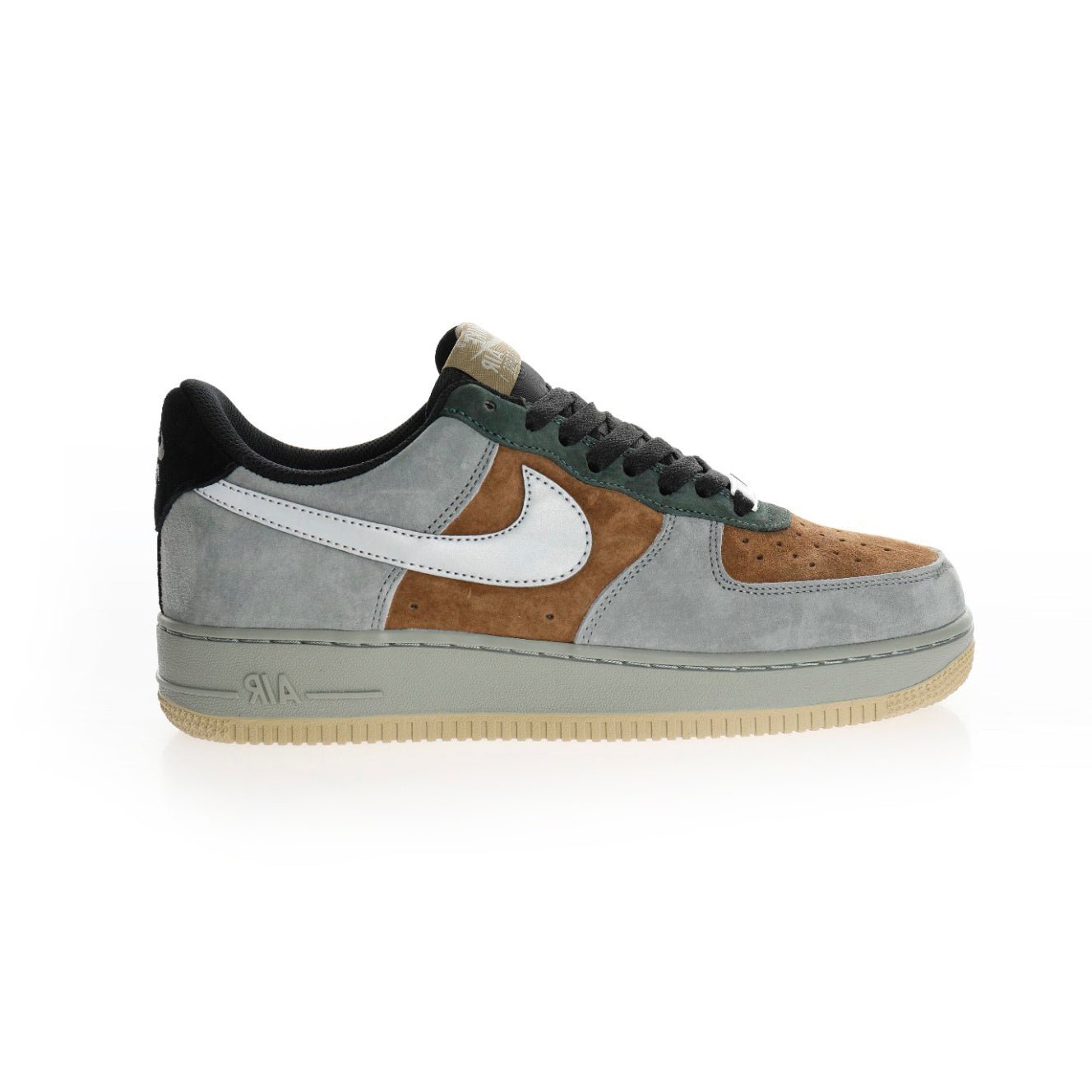 La mezcla de gris oscuro, marrón y verde oliva en los detalles ofrece una personalidad única, perfecta para quienes buscan destacar con calzado diferente. El swoosh blanco en contraste suma ese toque clásico propio de las Air Force 1, y la suela beige proporciona el irresistible acabado retro.
