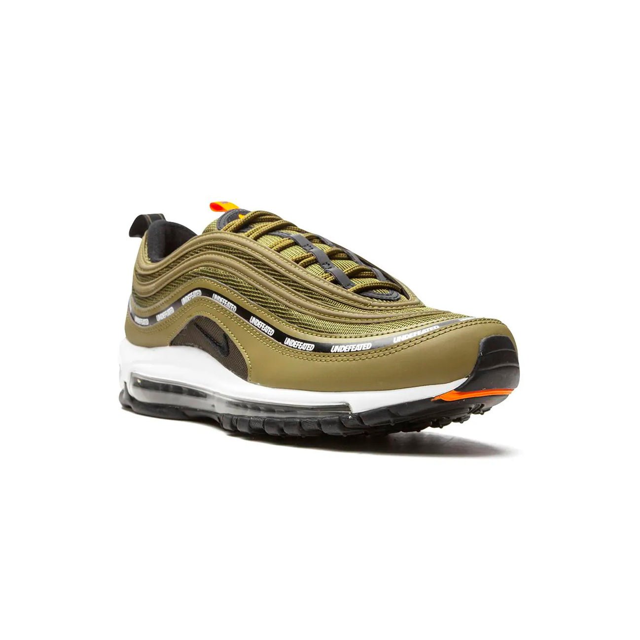 La famosa estructura ondulada de las Air Max 97 sigue intacta, reinterpretada con un estilo más urbano y agresivo. El contraste entre la suela blanca, el verde oliva y los detalles en negro y naranja hace que estas zapatillas sobresalgan en cualquier colección. Las Zapatillas Nike Air Max 97 Verde Militar Undefeated Hombre Edición Limitada representan rareza y máximo estilo.